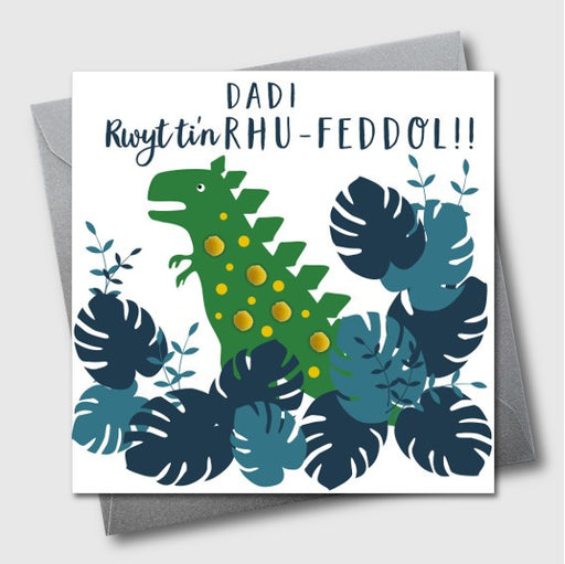 Welsh Father's day card 'Dadi rwyt ti'n Rhu-feddol' dinosaur pompoms