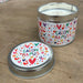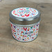 Soy wax tin scented candle delicately fragranced with Fig and Cassis, with a colourful hearts design with the Welsh words "Calon Hapus", a Happy Heart.