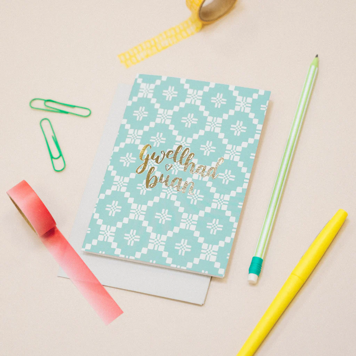 A bright and colourful Welsh get well soon card featuring hand-written text and original illustrations, and is finished in gold foil.