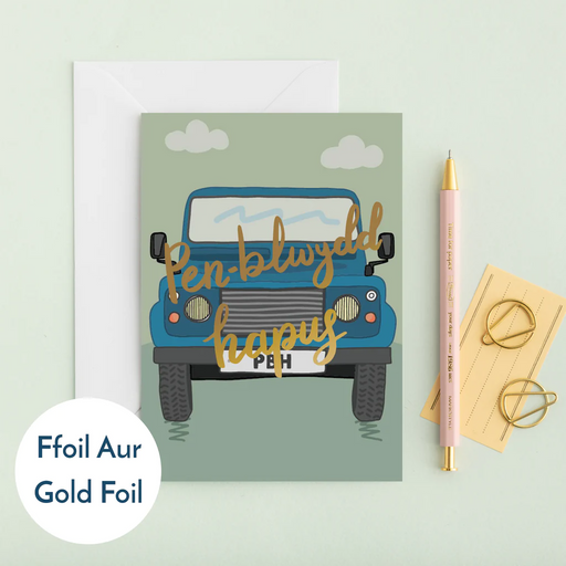 Welsh birthday card 'Penblwydd Hapus' blue land rover