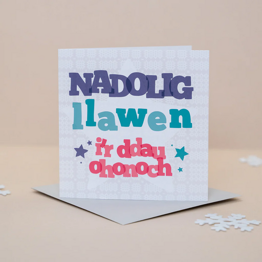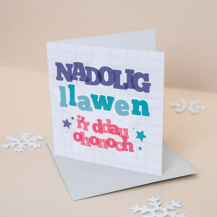 A colourful card to give at Christmas. 'Nadolig Llawen i'r ddau ohonoch' is Welsh for 'Merry Christmas to both of you'.
