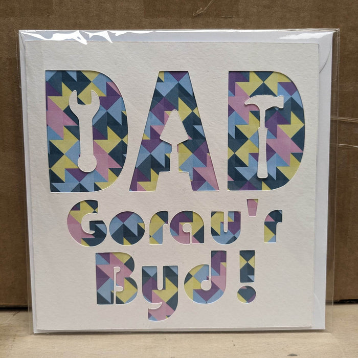 A lovely Welsh Father's Day card, featuring a beautiful papercut design over colourful background paper.
