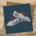 A stunning card with a beautiful blue background featuring Dad's lucky togs or football / rugby boots.'