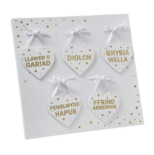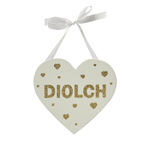 Choose from a selection of hanging heart plaques, decorated with gold glitter and a ribbon.