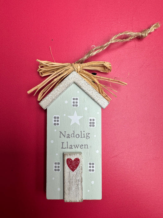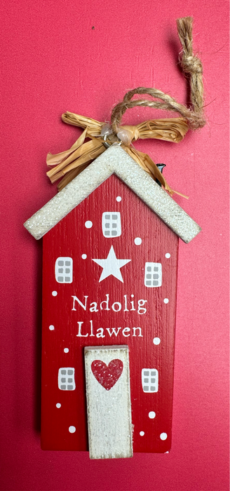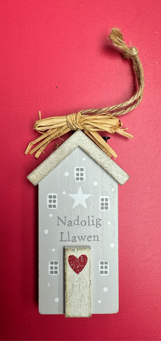 This beautiful wooden Christmas decoration depicts a rustic house with a glittery roof, windows and a 3D front door, and the Welsh words for Merry Christmas - "Nadolig Llawen".