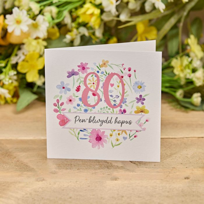 Birthday card 'Pen-blwydd Hapus 80' floral