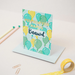 A bright and colourful Welsh birthday card featuring hand-written text and original illustrations, and is finished in gold foil.