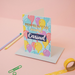A bright and colourful Welsh birthday card featuring hand-written text and original illustrations, and is finished in gold foil.
