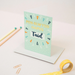 A bright and colourful Welsh birthday card featuring hand-written text and original illustrations, and is finished in gold foil.