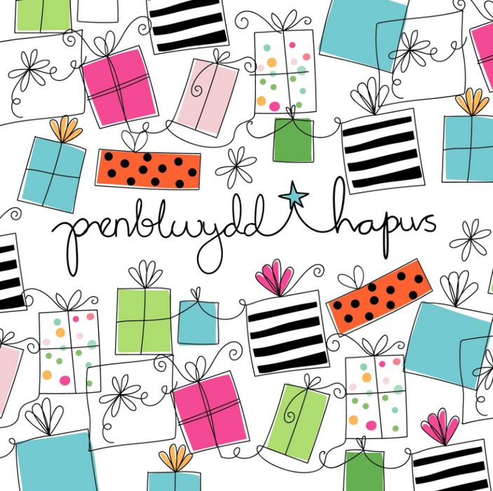 A gorgeous Welsh greeting card featuring illustrated gifts and text. Designed and made in the UK.