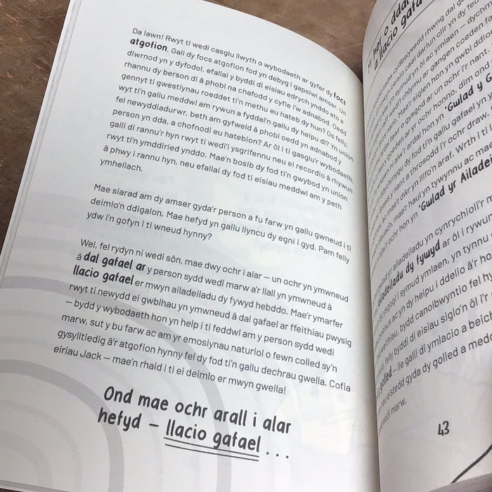 Welsh adaptation of Find Strength, Stay Hopeful and Get to Grips With Grief. Readers will discover the stories of other people who have been through grief. They will learn how to flex their 'grief muscles' in order to develop confidence, trust, grit, a resilient mindset - the ability to notice, accept and talk about emotions when they choose to.