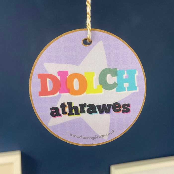 This colourful gift decoration features a bright Welsh tapestry design and bold text. It makes a perfect gift to say thank you.