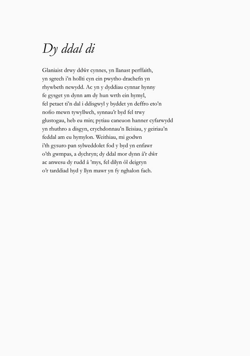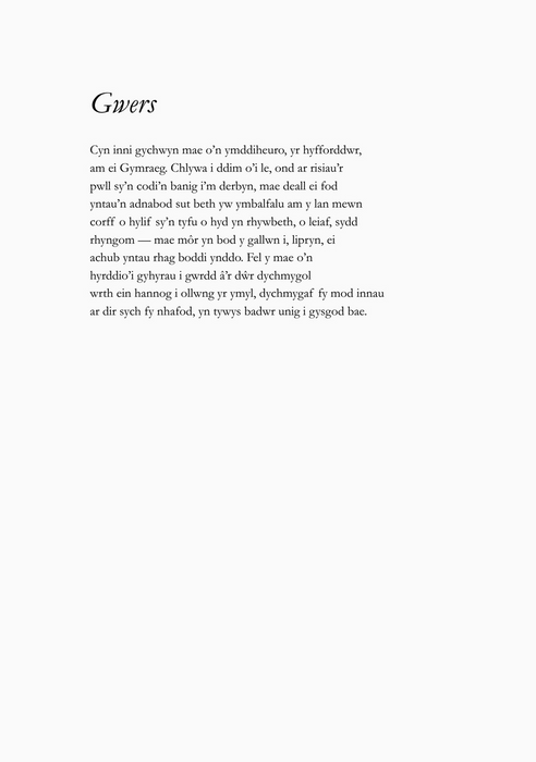 Casgliad o gerddi a osodwyd yn y tri uchaf ac yn deilwng o Goron Eisteddfod Genedlaethol 2023. Dywedodd Jason Walford Davies yn ei feirniadaeth mai ‘gogoniant y casgliad myfyrdodus a thra galluog hwn yw’r ddawn lachar a welir yma i gynnal, o’r dechrau o’r diwedd, un ddelwedd elfennaidd, lifeiriol: dŵr’. Gwneir hynny trwy am-yn-eilio cerddi dan y teitl ‘Gwers’, sy’n darlunio cwrs un wers nofio mewn canolfan hamdden ar nos Lun, gyda cherddi ehangach eu golwg, lle mae’r profiad o ddod yn rhiant yn wyneb argyfwng hinsawdd a bygythiad difodiant yn llifo trwy bopeth.