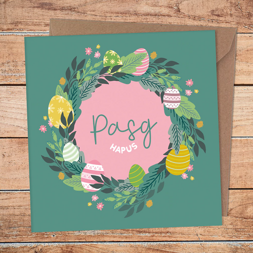 A beautiful card depicting an Easter wreath including beautiful Eggs and florals - perfect to send to someone at Pasg / Easter.