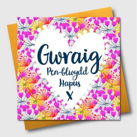 A beautiful modern Welsh language greeting card to wish your wonderful Wife a happy birthday.