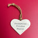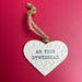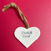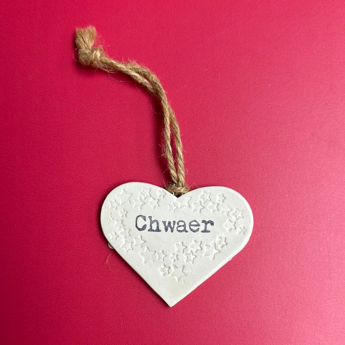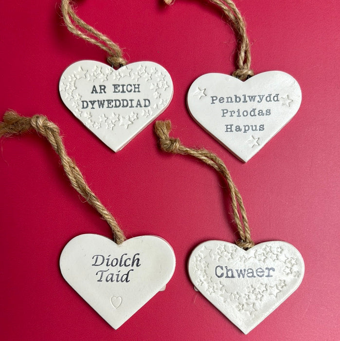White clay 6cm heart decoration hand stamped with Welsh words (see 'Details') with string for hanging. Or hang it around a bottle of wine for an instant gift.