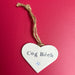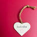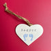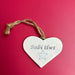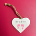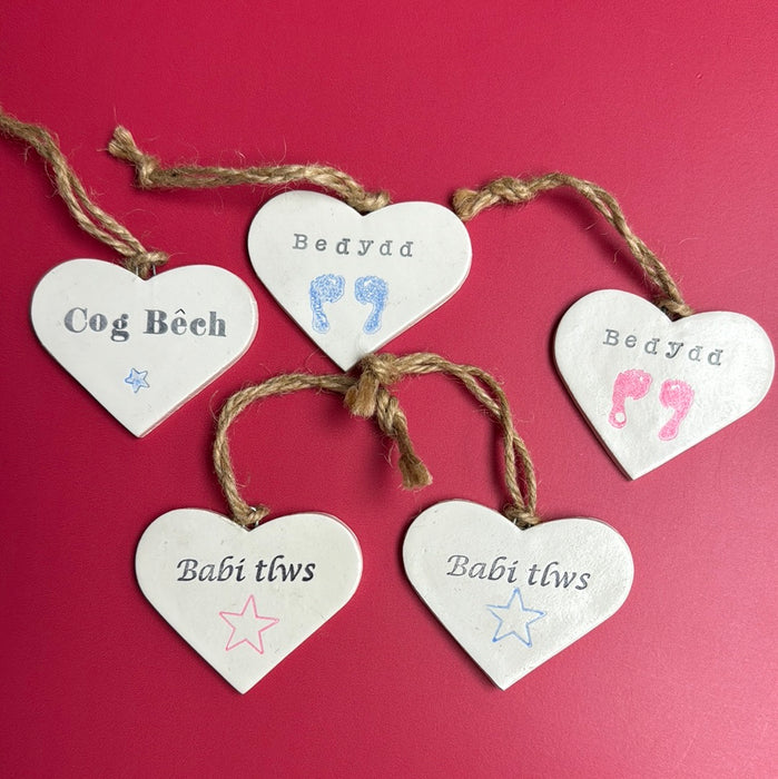 White clay 6cm heart decoration hand stamped with 'Babi Newydd' (New Baby in Welsh) with matching ribbon for hanging.