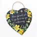 This heart shaped plaque is crafted from slate and features a hanging rope with painted text and image of florals including daffodils and bees.