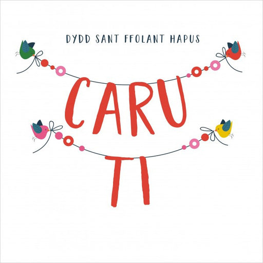 A beautiful bright Welsh language Valentine's Day card with love birds holding 'Caru Ti' bunting. Embellished with bright coloured pompoms and printed on high quality white FSC accredited board with a bright red envelope.