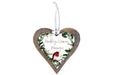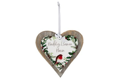 This beautiful wooden heart-shaped decoration features festive holly and a robin.