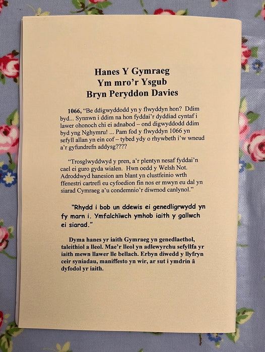 A pamphlet describing the history of the Welsh language nationally, regionally and locally.  The local situation reflects the situation of the language in many areas nowadays.  By the end of the pamphlet there are ideas, indeed a manifesto, how to deal with the future of the language.