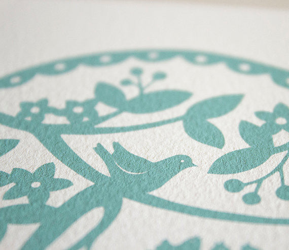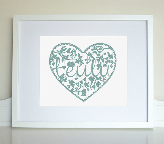 These simply beautiful prints feature an intricate silhouette filled with hearts, birds and foliage which frame the word "family".