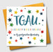 A beautiful modern Welsh language greeting card to congratulate someone on their fantastic GCSE exam results. The card has colourful writing against a background of stars, and is embellished with colourful pompoms and printed on high quality white FSC accredited board with a bright gold envelope.