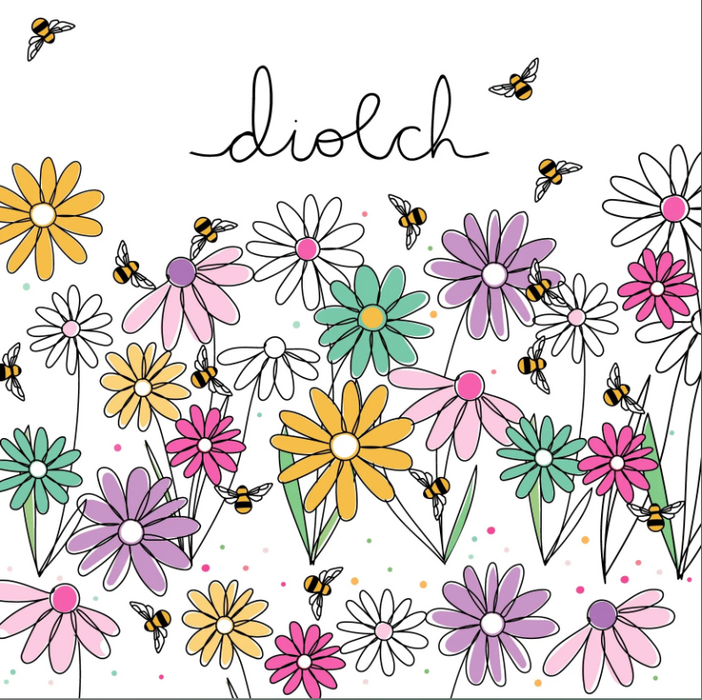 A gorgeous Welsh thank you card featuring colourful illustrations and text. Designed and made in the UK.