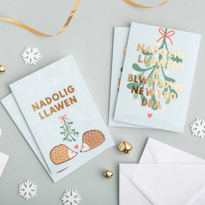 A set of 4 with a festive designs and gold foil. 'Nadolig Llawen a Blwyddyn Newydd Dda' is Welsh for 'Merry Christmas and Happy New Year'.