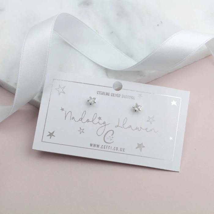 This pair of Welsh 'Nadolig Llawen' carded sterling silver earrings are star studs (please note image with card shows cubic zirconia earrings).