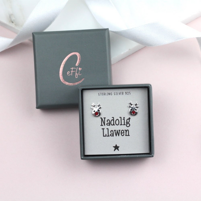 This pair of Welsh 'Nadolig Llawen' sterling silver earrings are snowflake studs with a cubic zirconia centre (please note image with box shows Rudolph earrings).